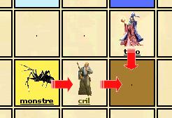 Les déplacements de tous les protagonistes du match sont simultanés. Il ne peut y avoir qu'un seul monstre ou mage par case, il y a donc des situations de blocage qui rendent certains déplacements impossibles. On ne peut se déplacer que d'une case à la fois, adjacente à la case de départ, dans une des 8 directions possibles (les diagonales comptent). |