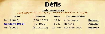 ![]() Sur les propositions de défi, on peut voir le nom du joueur suivit son niveau. Ensuite il y a la fourchette de classement autorisée. Pour pouvoir affronter ce joueur, vous devez être dans cette fourchette au classement. Puis est indiqué le temps maximal d'un tour (voir plus bas) et un message libre. Pour accepter le défi cliquez sur "relever". Remarque : vous pouvez cliquer sur "matchs en cours" pour observer d'autres matchs qui sont en train d'être disputés. |